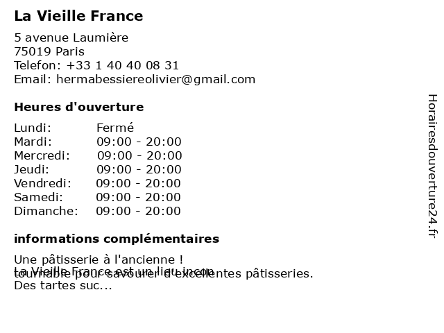 2 Restaurant Chez la Vieille (Distance: 3,76 km) 1 Rue Bailleul, 75001 Paris brasserie, café, chez, la, restaurant, restauration, vieille 3 École Maternelle Publique Vieille Mer (Distance: 6,20 km) 31 Avenue Romain Rolland, 93200 Saint-Denis cours, education, maternelle, mer, publique, services, vieille, École, école 4 École maternelle publique Vieille Mer (Distance: 6,20 km) 31 Rolland, 93200 Saint-Denis ecole, education, maternelle, mer, publique, services, vieille, école 5 Maître Edouard Vieille - Avocat (Distance: 8,21 km) 2-8 Rue Ancelle, 92200 Neuilly-sur-Seine avocat, avocate, avocats, civils, droits, edouard, juridiques, maître, vieille 6 Les Jardins De La Vieille Fontaine (Distance: 18,21 km) 8 Avenue Grétry, 78600 Maisons-Laffitte de, fontaine, jardins, la, les, restaurants, shana, vieille |