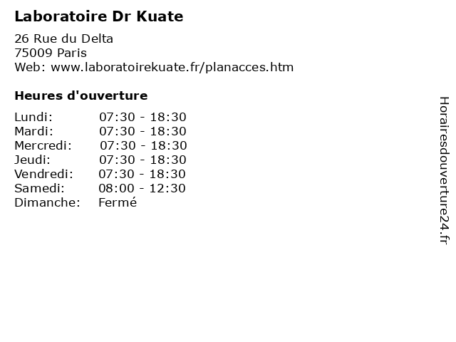1 Laboratoire Dr Kuate (Distance: 2,04 km) 28 Rue Riquet, 75019 Paris bureau, consultation, dr, kuate, laboratoire, maladie, med, médecin, médecine, pratique, thérapie, traitement 2 Laboratoire Dr Kuate (Distance: 13,74 km) 40 Boulevard Pasteur, 94260 Fresnes bureau, consultation, dr, kuate, laboratoire, maladie, med, médecin, médecine, pratique, thérapie, traitement 3 Janvier - Laboratoire Photografique Digital (Distance: 0,36 km) 42 rue de Rochechouart, 75009 Paris digital, janvier, laboratoire, laboratoires, photo, photografique, photographiques, révélé 4 Laboratoire d'analyse médicale (Distance: 0,59 km) 112 Rue de Maubeuge, 75010 Paris cafe, chaussures, d'analyse, enfants, homme, laboratoire, lingerie, mode femme, médicale, restaurant, service 5 Bio Inov - Laboratoire d'analyses médicales (Distance: 0,63 km) 18 rue de Dunkerque, 75010 Paris analyses, bio, d'analyses, inov, laboratoire, medicales, médicales, services 6 Laboratoire de Biologie Médicale - La Fayette - Cerballiance (Distance: 0,68 km) 75 Rue La Fayette, 75009 Paris biologie, cerballiance, de, dépistages, fayette, la, laboratoire, médicale |