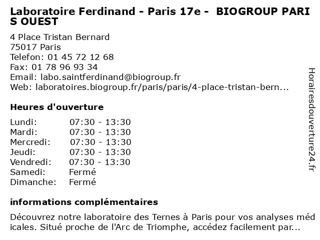 1 Laboratoire Bioclinic (Distance: 0,04 km) 10 avenue des Ternes, 75017 Paris analyse, bioclinic, labaoratoire, laboratoire, médical, sanguin, santé, test 2 Enterprise Location Voiture et Utilitaire - Paris 17E-Arrondissement Ternes (Distance: 0,16 km) 38 Avenue Des Ternes, 75017 Paris 17e, arrondissement, enterprise, et, location, paris, ternes, utilitaire, voiture 3 Pharmacie Saint-Ferdinand (Distance: 0,18 km) 9 Rue Saint-Ferdinand, 75017 Paris ferdinand, herboristerie, médicaments, paramédical, parapharmacie, pharmacie, pharmacien, saint, santé, traitements 5 Saint Ferdinand Immobilier (Distance: 0,21 km) 21 rue Saint-Ferdinand, 75017 Paris agence, ferdinand, gestion, immobilier, location, saint, transaction, vente 6 Laboratoire Via Lab (Distance: 0,23 km) 196 Boulevard Pereire, 75017 Paris adjointe, combinée, conjointe, dentaire, lab, laboratoire, prothèse, via |
