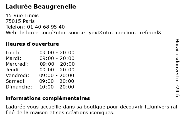 1 La Redoute Intérieurs - Galeries Lafayette Paris Beaugrenelle (Distance: 0,01 km) 7 Rue Linois, 75015 Paris beaugrenelle, galeries, intérieurs, la, lafayette, magasin d'ameublement et de décoration, magasin de linge de maison, magasin de mobilier de chambre à coucher, mobilier pour les bureaux, paris, redoute 2 Boutique SFR PARIS BEAUGRENELLE (Distance: 0,03 km) 5 RUE LINOIS, 75015 Paris beaugrenelle, boutique, boutique mobile, internet, paris, service, sfr 3 AMPM - Galeries Lafayette Paris Beaugrenelle (Distance: 0,03 km) 7 Rue Linois, 75015 Paris ampm, beaugrenelle, galeries, lafayette, magasin d'ameublement et de décoration, magasin de linge de maison, magasin de mobilier de chambre à coucher, mobilier pour les bureaux, paris 4 Nature et Découvertes Beaugrenelle (Distance: 0,05 km) 12 Rue Linois, 75015 Paris beaugrenelle, découvertes, et, nature 5 ESPRIT BEAUGRENELLE (Distance: 0,05 km) 16 rue Linois, 75015 Paris accessories, beaugrenelle, clothing, collection, esprit, fashion 6 Chipotle (Centre Commercial Beaugrenelle) (Distance: 0,05 km) 1 Rue Linois, 75015 Paris beaugrenelle, centre, chipotle, commercial, food, restaurant, taco |