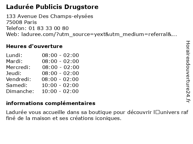 1 Publicis Drugstore (Distance: 0,03 km) 133 Av. des Champs-Élysées, 75008 Paris drugstore, food, publicis, restaurants, steak, steakhouse 2 Restaurant Drugstore Publicis (Distance: 0,03 km) 133 Avenue des Champs-Élysées, 75008 Paris bistrot, brasserie, café, drugstore, publicis, restaurant, restauration 3 Publicis Drugstore (Distance: 0,03 km) 133 Avenue des Champs-Élysées, 75008 Paris bar, bistro, bistrot, brasserie, café, drugstore, publicis, restaurant, restauration 4 5 Le Drugstore Parisien (Distance: 2,13 km) 1 cour du Havre, 75008 Paris cheveux, cosmétique, drugstore, le, maquillage, parfum, parisien, soins 6 LADURÉE AU PRINTEMPS DE LA MAISON (Distance: 2,33 km) 64 boulevard Haussmann, 75009 Paris au, beauté, de, la, ladurée, maison, maquillage, printemps, produits cosmétiques, shopping |