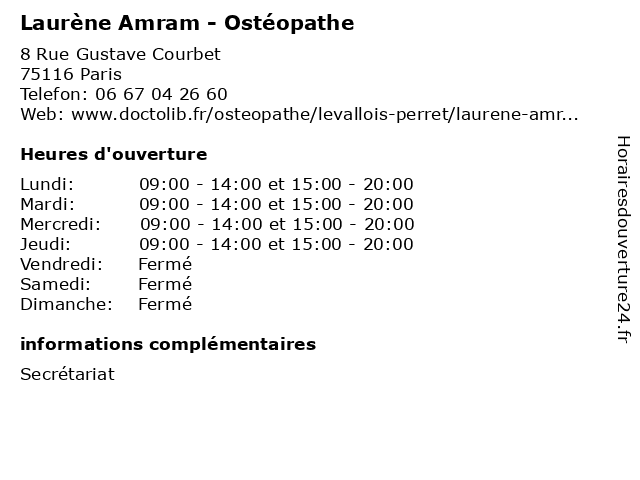 1 Dr Nathalie Amram - Orthodontiste (Distance: 0,47 km) 45 Rue Decamps, 75116 Paris amram, consultation, docteur, dr, med, médecin, médecine, nathalie, orthodontiste, traitement 2 Muriel Amram - Hypnothérapeute (Distance: 0,48 km) 22 Bis Rue Pétrarque, 75016 Paris amram, hypno, hypnose, hypnothérapeute, muriel, sante 3 Laurène Pajot - Ostéopathe (Distance: 0,66 km) 126 Rue de la Faisanderie, 75116 Paris laurene, laurène, ostéo, ostéopathe, ostéopathes, pajot, soins 4 Maître Laurène Livertoux - Avocate (Distance: 0,95 km) 25 Rue de Lübeck, 75116 Paris avocate, avocats, cabinet, conseils, contentieux, juridique, justice, laurène, litiges, livertoux, maître, services 5 Muriel Amram - Hypnothérapeute (Distance: 1,73 km) 76 Avenue des Champs-Élysées, 75008 Paris amram, hypnose, hypnotherapeute, hypnothérapeute, muriel, sante, soins 6 Dr Laurène Ah-Sing - Chirurgien-dentiste (Distance: 3,82 km) 13 Avenue de l'Opéra, 75001 Paris ah, chirurgien, consultation, dentiste, docteur, dr, laurène, med, médecin, médecine, secrétariat, sing, traitement |