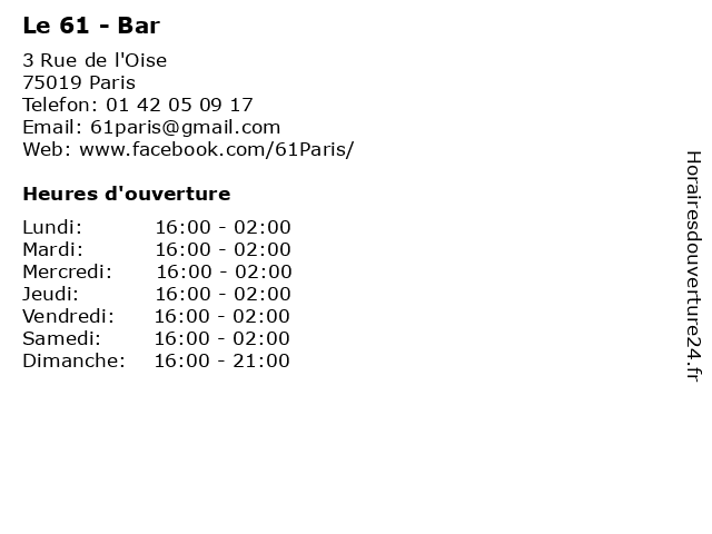 1 Le 61 - Bar Culturel (Distance: 0,00 km) 3 Rue de l' Oise, 75019 Paris 61, bar, boissons, culturel, le, nourriture, restaurants, service 3 Yespark, location de parking au mois - 61 rue de Bagnolet - Paris 20 (Distance: 3,88 km) 61 Rue de Bagnolet, 75020 Paris 20, 61, au, bagnolet, de, location, mois, paris, parking, rue, yespark 4 Résidence sociale PARIS CHARONNE 61 - Adoma (Distance: 4,11 km) 61 Rue de Charonne, 75011 Paris 61, adoma, charonne, paris, résidence, sociale 6 Hotel BW Premier 61 Paris Nation (Distance: 5,30 km) 61 Rue de la Voûte, 75012 Paris 61, bar, bw, chambres, hotel, nation, paris, premier, restaurant |