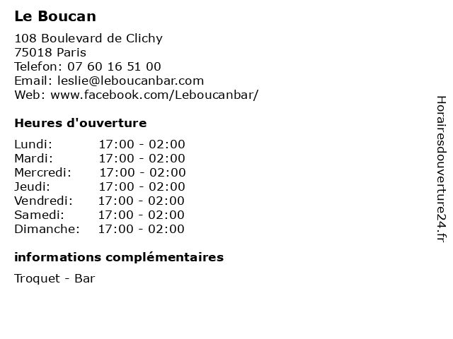 1 Le Boucan (Distance: 0,00 km) 108 Boulevard de Clichy, 75018 Paris bar, boisson, boucan, dîner, le, nourriture, petit déjeuner, restaurant 3 Le Tambour (Distance: 2,33 km) 41 Rue Montmartre, 75002 Paris cuisine, européen, français, le, restaurant, restauration, tambour, troquet 5 La Cantine du Troquet (Distance: 4,15 km) 79 rue du Cherche Midi, 75006 Paris boulangers, cafes, cantine, du, epiceries, fromagers, la, patisseries, restaurant, troquet 6 Duplex - La Cantine du Troquet (Distance: 4,64 km) 53 Boulevad de grenelle, 75015 Paris boulangers, cafes, cantine, du, duplex, epiceries, fromagers, la, patisseries, restaurant, troquet |