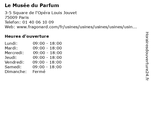 1 Musée du Parfum - Fragonard (Distance: 0,09 km) 9 Rue Scribe, 75009 Paris cosmétique, du, fragonard, musée, parfum, parfumerie 2 Le Théâtre Musée des Capucines - Fragonard (Distance: 0,24 km) 39 rue des Capucines, 75002 Paris capucines, des, fragonard, le, lotions, musée, parfumeur, parfums, théâtre 3 Le Musée de l'Orangerie (Distance: 0,77 km) - Place de la Concorde, 75001 Paris ancien, art, de, exposition, histoire, l'orangerie, le, livre, monument, musée, savoir 4 Musée national Gustave Moreau (Distance: 0,77 km) 14 Rue de la Rochefoucauld, 75009 Paris art, establishments, gustave, history, moreau, museums, musée, national 5 Musée Grevin (Distance: 0,95 km) 10 Boulevard Montmartre, 75009 Paris ancien, art, exposition, grevin, livre, monument, musée, savoir 6 Musée des Arts Décoratifs (Distance: 1,03 km) 107 Rue de Rivoli, 75001 Paris arts, des, déco, décoratifs, musée |