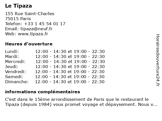 1 Tipaza (Distance: 0,01 km) 155 Rue Saint-Charles, 75015 Paris italien, restaurant, restauration, tipaza 2 Restaurant Le Tipaza (Distance: 3,39 km) 130 Avenue Pierre Brossolette, 92240 Malakoff bar, bistro, bistrot, brasserie, café, le, pub, restaurant, restauration, resto, tipaza 3 Tipaza 93 (Distance: 18,92 km) 7 Place De l Hotel De Ville, 93600 Aulnay Sous Bois 93, restaurants, tipaza |