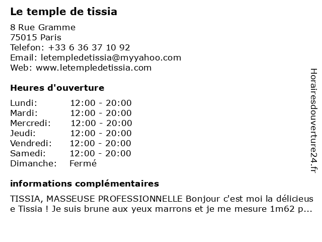 1 Le Temple de l'Optique (Distance: 0,20 km) 53 Rue de la Croix Nivert, 75015 Paris de, l'optique, le, lunettes, monture, opticien, optique, solaire, temple, vue 2 Dr Cécile Thonnard du Temple - Cardiologue (Distance: 2,52 km) 36 rue d'Assas, 75006 Paris 75006, arthur, cardiologie, cardiologue, cécile, dr, du, institut, paris, temple, thonnard, vernes 3 Temple - Noble Art (Distance: 3,70 km) 11 Rue Molière, 75001 Paris art, boxe, entraînement, exercices, gymnase, noble, sports, temple 4 Temple Rock Tavern (Distance: 4,30 km) 31bis Rue des Lombards, 75001 Paris bar, boissons, cocktail, la, musique, pub, rock, tavern, temple 5 Tabac Le Troquet du Temple (Distance: 4,44 km) 9 Rue du Temple, 75004 Paris bar, cigarettes, du, jeux, journaux, le, papeterie, presse, restauration, tabac, temple, troquet 6 Pharmacie du temple (Distance: 4,58 km) 43 Rue Du Temple, 75004 Paris du, médicaments, pharmacie, santé, soins, temple |
