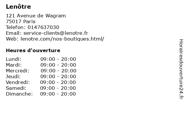 1 Lenôtre (Distance: 1,05 km) 15 boulevard de Courcelles, 75008 Paris gateaux, lenôtre, pâtisserie, restauration 2 Lenôtre (Distance: 2,26 km) 48 avenue Victor Hugo, 75016 Paris gateaux, lenôtre, pâtisserie, restauration 3 Lenôtre (Distance: 2,89 km) 209 avenue Achille Peretti, 92200 Neuilly-sur-Seine gateaux, lenôtre, pâtisserie, restauration 4 Lenôtre (Distance: 3,04 km) 36 avenue de la Motte-Picquet, 75007 Paris gateaux, lenôtre, pâtisserie, restauration 6 |