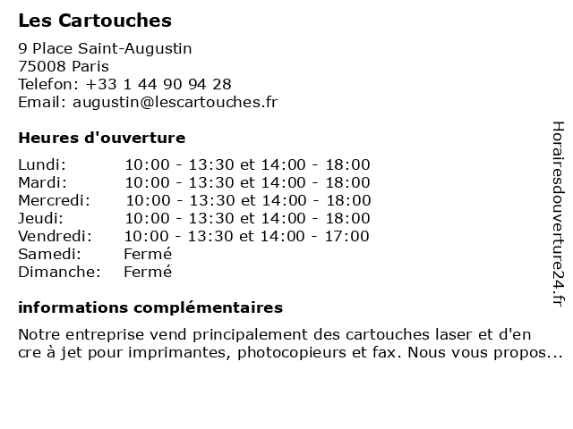 2 Les Cartouches (Distance: 7,36 km) 24 Avenue du Général Leclerc, 92100 Boulogne-Billancourt cartouches, les 3 Office Dépôt (Distance: 0,28 km) 10 rue de la Pépinière, 75008 Paris bureau, cartouches, depot, dépôt, fournitures, office, papeterie 4 Office Dépôt (Distance: 0,72 km) 168 rue du Faubourg Saint Honoré, 75008 Paris bureau, cartouches, depot, dépôt, fournitures, office, papeterie 5 Office Dépôt (Distance: 1,64 km) 9 rue de Châteaudun, 75009 Paris bureau, cartouches, depot, dépôt, fournitures, office, papeterie 6 Point d'Encre (Distance: 1,99 km) 4 passage Petit Cerf, 75017 Paris cartouches & toners, d'encre, fournitures de bureau, informatique et bureautique, papeterie, point, sièges & mobilier de bureau |