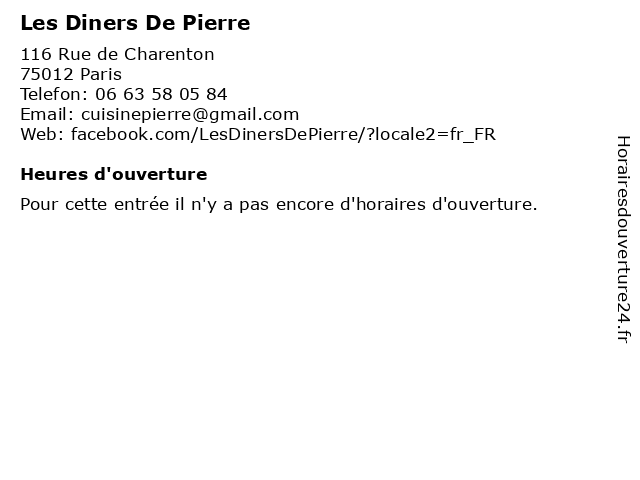 1 Le Diners De Pierre (Distance: 1,60 km) 128 Boulevard De Charonne, 75020 Paris diners, pierre, restaurants 2 Diners Spectacles Productions (Distance: 3,57 km) 10 Rue Des Saints Peres, 75007 Paris diners, productions, restaurants, spectacles 4 Les Diners d Eloise (Distance: 9,22 km) Lagardere Paris Racing, 75016 Paris diners, eloise, restaurants 5 Café du Temple (Distance: 2,57 km) 14 Rue du Faubourg du Temple, 75011 Paris brunch, cafe, café, diners, du, déjeuners, lucien, restaurants, temple 6 58 Tour Eiffel (Distance: 5,91 km) 1 Tour Eiffel, Champ de Mars, 75007 Paris 58, business, diners, eiffel, food, restaurants, tour |