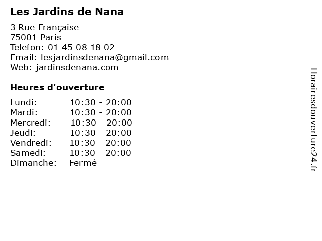 1 Les Jardins de Nana (Distance: 4,19 km) 72 Rue Pierre Demours, 75017 Paris beauté, cheveux, coiffure, de, jardins, les, manucure, nana, soins 2 Jardins de Babylone (Distance: 0,57 km) 6 rue des jeûneurs, 75002 Paris aménagement, architecte, babylone, de, jardin, jardins, paysagiste 3 Chez Nana Paris (Distance: 1,00 km) 19 , rue d'hauteville, 75010 Paris accessoires, bijoux, chez, femme, mode, nana, paris 4 Maître Nana Botchorichvili - Avocate (Distance: 1,04 km) 35 Avenue de l’Opéra, 75002 Paris avocate, avocats, botchorichvili, cabinet, conseils, contentieux, juridique, justice, litiges, maître, nana, services 5 Résidence EHPAD Les Jardins de Montmartre (Distance: 2,34 km) 18 rue Pierre Picard, 75018 Paris agees, de, ehpad, jardins, les, maison, montmartre, personnes, retraite, résidence 6 Jardins de l'Archipel des Berges de Seine (Du 29 octobre au 28 février) (Distance: 2,68 km) - quai d'Orsay, 75007 Paris 28, 29, au, berges, de, des, du, février, jardin, jardins, l'archipel, octobre, parc, seine, square |