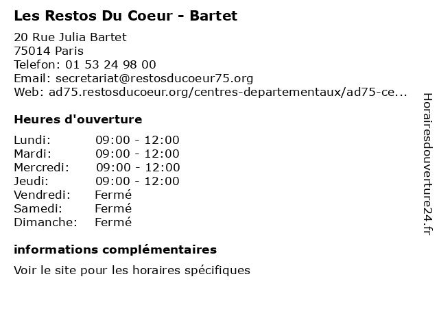 1 Square Julia-Bartet (Distance: 0,07 km) 1 rue Julia-Bartet, 75014 Paris bartet, jardin, julia, parc, square 2 Les Restos Du Coeur (Distance: 2,13 km) 30 rue Saint Yves, 02220 Braine aides, alimentaire, coeur, du, les, restos, santé, solidarité, soutien 3 Les Restos Du Coeur (Distance: 9,18 km) 33 Rue Henri Dunant, 92500 Rueil-Malmaison aide, coeur, dons, du, les, resto, restos, solidarité, vente 4 Les Restos Du Coeur (Distance: 9,37 km) 1 Place de la logistique, 94654 Rungis aide, coeur, dons, du, les, resto, restos, solidarité, vente 5 Les Restos Du Coeur (Distance: 9,54 km) 21 Rue Léon Geffroy, 94400 Vitry-sur-Seine aide, coeur, dons, du, les, resto, restos, solidarité, vente 6 Les Restos Du Coeur"Centre adultes" (Distance: 9,94 km) 4 Rue Louis Armand, 92600 Asnières sur Seine adultes", aide, coeur"centre, dons, du, les, resto, restos, solidarité, vente |