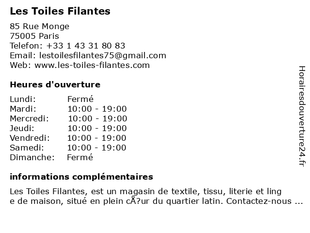1 Toiles De Mayenne (Distance: 1,72 km) 52 Rue de Rivoli, 75004 Paris canapés, de, mayenne, rideaux, tissus, toiles 2 Toiles De Mayenne (Distance: 1,77 km) 9 Rue de Mézières, 75006 Paris canapés, de, mayenne, rideaux, tissus, toiles 3 Toiles de Mayenne (Distance: 2,71 km) 5 place des Victoires, 75001 Paris accessoires, boutique, de, déco, luminaires, maisons, mayenne, toiles 4 Les Toiles De Voltaire (Distance: 2,93 km) 27 Rue Des Boulets, 75011 Paris restaurants, toiles, voltaire 5 Toiles De Mayenne (Distance: 3,89 km) 36 Avenue Bosquet, 75007 Paris canapés, de, magasin, mayenne, rideaux, tissus, toiles 6 Toiles De Mayenne (Distance: 3,92 km) 64 Boulevard Haussmann, 75009 Paris canapés, de, mayenne, rideaux, tissus, toiles |