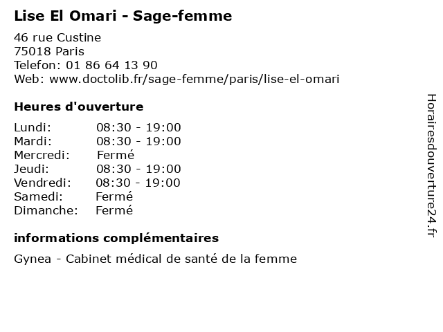 1 Dr Fairouz El Battat - Rhumatologue (Distance: 0,34 km) 115 Rue Caulaincourt, 75018 Paris battat, dr, el, fairouz, rhumatisme, rhumatologue, sante, soins 2 Hajar El Hajjam - Chiropracteur (Distance: 0,35 km) 2 Square de Clignancourt, 75018 Paris chiropracteur, el, hajar, hajjam, medical, ostéopathique, secretariat, thérapie 3 Ain El Hammam (Distance: 0,50 km) 21 Rue De Suez, 75018 Paris ain, amina, hammam, lachachi, restaurants 4 Restaurant El Pulpo (Distance: 0,72 km) 85 Rue Lamarck, 75018 Paris bar, bistro, bistrot, brasserie, café, el, pulpo, restaurant, restauration 5 Nedjmet El Djazair (Distance: 0,75 km) 47 Boulevard De La Chapelle, 75010 Paris djazair, nedjmet, restaurants 6 |