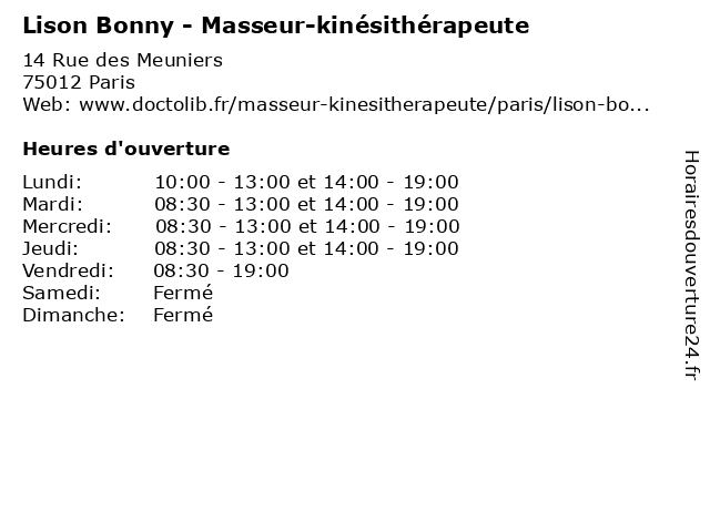 | Mardi | 08:30-13:00 et 14:00-19:00 |