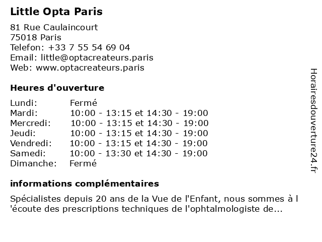 1 Les Créateurs d'Opta Le 63 Paris (Distance: 0,48 km) 63 Rue des Abbesses, 75018 Paris 63, créateurs, d'opta, le, les, paris 2 Les Créateurs d'Opta Le 25 Paris (Distance: 0,56 km) 25 Rue des Abbesses, 75018 Paris 25, créateurs, d'opta, le, les, paris 3 Le Bar d'Opta (Distance: 0,68 km) 63 rue des Abesses, 75018 Paris bar, d'opta, entretien, le, lentilles, lunettes, opticien, solaire, vue 4 Little Opta (Distance: 0,75 km) 81 rue Caulaincourt, 75018 Paris enfants, entretien, lentilles, little, lunettes, opta, opticien, solaire, vue 5 Restaurant The Little Italy (Distance: 1,04 km) 5 Place Clichy, 75017 Paris bar, brunch, italy, little, restaurant, restauration, the 6 My Little Optic (Distance: 1,46 km) 37 Rue Saint-Lazare, 75009 Paris little, lunettes, monture, my, optic, opticien, optique, solaire, vue |