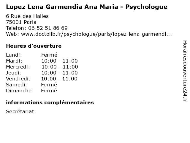 1 Maître Maria Lopez de Tejada - Avocate (Distance: 0,57 km) 26 rue Etienne Marcel, 75002 Paris avocate, avocats, cabinet, conseils, contentieux, de, juridique, justice, litiges, lopez, maria, maître, services, tejada 2 Dr Elisa Lopez Hernandez - Neurologue (Distance: 0,84 km) 15 Rue de Rivoli, 75004 Paris cerveau, dr, elisa, hernandez, lopez, nerf, neurologie, neurologue 3 Studio Ana'e (Distance: 1,18 km) 11 rue des Carmes, 75005 Paris ana'e, beaute, coiffure, services, studio 4 Dr Frédéric Lopez de Ayora - Médecin généraliste (Distance: 1,36 km) 64 Rue de Rennes, 75006 Paris ayora, de, docteur, dr, frédéric, generaliste, généraliste, lopez, medecin, médecin, soins 5 Pierre Morales Lopez - Psychologue (Distance: 1,39 km) 16 Rue de l'Échiquier, 75010 Paris folie, lopez, morales, pierre, psychiatre, psychiatrie, psychiatrique, psychologue 6 Dolores Lopez - Psychothérapeute (Distance: 1,64 km) 92 Rue de Rennes, 75006 Paris dolores, folie1, lopez, psychiatre, psychiatrie, psychiatrique, psychothérapeute |