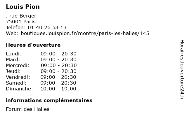 1 Louis Pion (Distance: 0,08 km) . Porte Berger, 75001 Paris bijouteries, bijoux, création, louis, montres, pion, réparation 2 Louis Pion (Distance: 0,68 km) 14 rue du Temple, 75004 PARIS accessories, jewelry, louis, pion, watches 3 Louis Pion (Distance: 0,81 km) 99 rue de Rivoli, 75001 Paris beaute &sante, bijoux, boutigue, decoration, louis, mode femmes, mode hommes, optique, pion, restaurants, sport 4 Louis Pion (Distance: 1,17 km) 19 boulevard Montmartre, 75002 Paris accessories, jewelry, louis, pion, watches 5 Louis Pion (Distance: 1,34 km) 35, boulevard St Michel, 75005 Paris accessories, jewelry, louis, pion, watches 6 Louis Pion (Distance: 3,04 km) 52, avenue des Champs Elysées, 75008 Paris accessories, jewelry, louis, pion, watches |