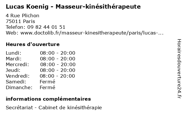 1 Lucas Perrier - Chiropracteur Paris 11 (Distance: 0,03 km) 2 Rue Plichon, 75011 Paris 11, bien-être, chiropracteur, douleur, lombalgie, lucas, paris, perrier, santé, sciatique, thérapie manuelle, torticolis 2 Camille Lucas - Masseur-kinésithérapeute (Distance: 0,66 km) 20 Rue de Belfort, 75011 Paris camille, kiné, kinésithérapeute, lucas, masseur, rééducation, soin 3 Dr Lucas Vericel - Chirurgien-dentiste (Distance: 0,67 km) 115 Boulevard Voltaire, 75011 Paris chirurgien, consultation, dentiste, docteur, dr, lucas, med, médecin, traitement, vericel 4 Dr Lucas Leszczynski - Médecin généraliste (Distance: 1,12 km) 24 Rue de l’Est, 75020 Paris docteur, dr, generaliste, généraliste, leszczynski, lucas, medical, médecin, soin 5 Lucas Tonini Livraison (Distance: 1,30 km) 86 b Rue Amelot, 75011 Paris livraison, lucas, restaurants, tonini 6 Lucas Chausseur (Distance: 1,42 km) 32 rue Jacques Louvel-Tessier, 75010 Paris appareillage du pied, chausseur, chaussures, lucas, podo-orthésiste |