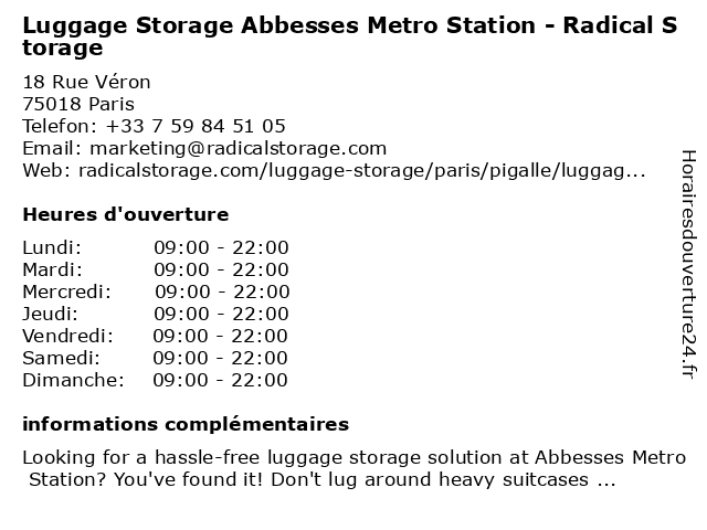1 Nannybag Luggage Storage - Place des Abbesses (Distance: 0,00 km) 18 Rue Véron, 75018 Paris abbesses, des, luggage, nannybag, place, storage 2 Luggage Storage Blanche Metro Station - Radical Storage (Distance: 0,32 km) 35 Rue Pierre Fontaine, 75009 Paris blanche, luggage, luggage storage, luggage storage near me, metro, radical, station, storage 3 Luggage Storage Pigalle Metro Station - Radical Storage (Distance: 0,43 km) 57 Blvd Marguerite de Rochechouart, 75009 Paris luggage, luggage storage, luggage storage near me, metro, pigalle, radical, station, storage 4 Nannybag Luggage Storage - Place de Clichy (Distance: 0,72 km) 11 Avenue De Clichy, 75017 Paris clichy, de, luggage, nannybag, place, storage 5 Radical Storage - Luggage Storage Chateau Rouge Metro Station (Distance: 0,81 km) 39 Rue de Clignancourt, 75018 Paris chateau, luggage, luggage storage, luggage storage near me, metro, radical, rouge, station, storage 6 Luggage Storage Barbès - Rochechouart Metro Station - Radical Storage (Distance: 0,94 km) 6 Rue du Delta, 75009 Paris barbès, luggage, luggage storage, luggage storage near me, metro, radical, rochechouart, station, storage |