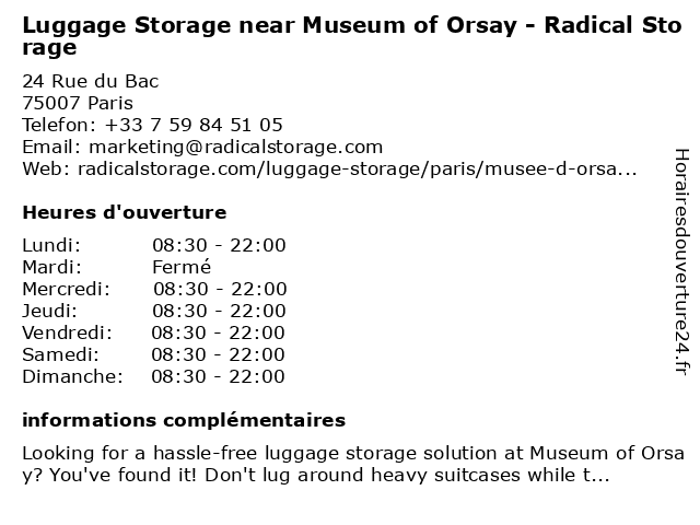 1 Luggage Storage Museum of Orsay - Radical Storage (Distance: 0,00 km) 24 Rue du Bac, 75007 Paris luggage, luggage storage, luggage storage near me, museum, of, orsay, radical, storage 2 Musée d'Orsay (Distance: 0,28 km) 1 Rue de la Légion d'Honneur, 75007 Paris art, d'orsay, establishments, history, museums, musée 3 Orsay Museum - Ouverture (Distance: 0,28 km) 1 rue de la Légion d'Honneur, 75007 Paris museum, orsay, ouverture, sculpture 4 Orsay Museum - Librairie - boutique (Distance: 0,28 km) 1 rue de la Légion d'Honneur, 75007 Paris boutique, librairie, museum, orsay, sculpture 5 Orsay Museum - au restaurant (Distance: 0,28 km) 1 rue de la Légion d'Honneur, 75007 Paris au, food, museum, orsay, restaurant, sculpture 6 Orsay Museum - au restaurant - Tea Room (Distance: 0,28 km) 1 rue de la Légion d'Honneur, 75007 Paris au, food, museum, orsay, restaurant, room, sculpture, tea |