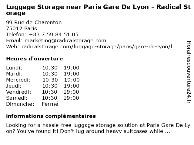 1 Radical Storage - Luggage Storage Paris Gare de Lyon (Distance: 0,00 km) 99 Rue de Charenton, 75012 Paris de, gare, luggage, luggage storage, luggage storage near me, lyon, paris, radical, storage 2 L'Escale De Lyon (Distance: 0,02 km) L Escale De Lyon, 75012 Paris escale, kenitra, lyon, restaurants 3 Hôtel Prince Albert Lyon Bercy (Distance: 0,05 km) 108 Rue de Charenton, 75012 Paris albert, bar, bercy, chambres, hotel, hôtel, lyon, prince, restaurant, service 4 Hôtel Trianon Gare de Lyon (Distance: 0,20 km) 52 Boulevard Diderot, 75012 Paris bar, chambres, de, gare, hotel, hôtel, lyon, restaurant, service, trianon 5 HSBC Paris Gare De Lyon (Distance: 0,25 km) 26 bis Avenue Daumesnil, 75012 Paris de, gare, hsbc, lyon, paris 6 Radical Storage - Luggage Storage near Gare de Lyon (Distance: 0,28 km) 15 Rue Michel Chasles, 75012 Paris de, gare, luggage, luggage storage, luggage storage near me, lyon, near, radical, storage |