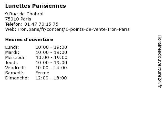 1 Agence Acquisitions Immo Parisiennes (Distance: 0,39 km) 26 Rue des Petites Écuries, 75010 Paris acquisitions, agence, immo, parisiennes 2 Les Grenouilles Parisiennes (Distance: 0,64 km) 29 31, 75010 Paris grenouilles, parisiennes, plateau, restaurants 3 Dingue de Lunettes (Distance: 0,71 km) 21 Rue Jean Poulmarch, 75010 Paris de, dingue, lunettes, monture, opticien, optique, solaire, vue 4 Mes Lunettes et Moi (Distance: 1,17 km) 29 Rue des Martyrs, 75009 Paris et, lunettes, mes, moi, monture, opticien, optique, solaire, vue 5 Ophtalmologique Adolphe de Rothschild - Consultations et examens ophtalmologiques généralistes, dépistage, lunettes, et suivi (Distance: 1,70 km) 29 Rue Manin, 75019 Paris adolphe, bureau, consultation, consultations, de, dr, dépistage, et, examens, généralistes, la maladie, la médecine, la pratique, lunettes, med, médecin, ophtalmologique, ophtalmologiques, rothschild, suivi 6 Lunettes Pour Tous Paris Gare Saint Lazare (Distance: 2,18 km) 13 Rue d'Amsterdam, 75008 Paris gare, lazare, lunettes, paris, pour, saint, tous |