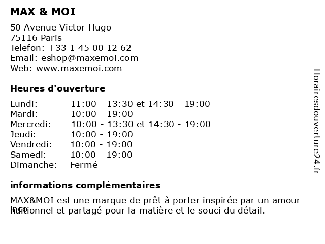 1 MAX & MOI (Distance: 0,70 km) 17 Rue Gustave Courbet, 75116 Paris cachemire, fashion, fourrure, leather, luxe, luxury, max & moi, mode, prêt à porter, vêtement 2 MAX & MOI (Distance: 1,25 km) 30 Rue Marbeuf, 75008 Paris cachemire, fashion, leather, luxe, luxury, max, max & moi, mode, moi, paris, prêt à porter, soie 3 MAX & MOI (Distance: 1,39 km) 15 Rue du Commandant Pilot, 92200 Neuilly-sur-Seine cachemire, fourrure, luxe, luxury, max, max & moi, mode, moi, paris, prêt à porter, soie, vêtement 4 MAX & MOI (Distance: 1,47 km) 124 Rue de Courcelles, 75017 Paris cachemire, fashion, fourrure, leather, luxe, luxury, max & moi, mode, prêt à porter, vêtement 6 MAX & MOI (Distance: 3,11 km) 4 Rue Scribe, 75009 Paris cachemire, fashion, fourrure, leather, luxe, luxury, max, mode, moi, prêt à porter, vêtement |