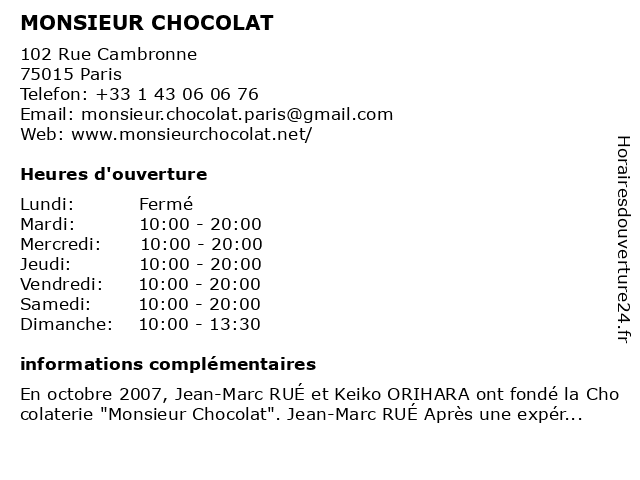 2 Jicara Chocolat (Distance: 0,87 km) 91 rue des Entrepreneurs, 75015 Paris boutique, chocolat, chocolaterie, chocolatier, de, jicara, neuville 3 Chocolat De Neuville (Distance: 2,77 km) 29 Rue de Buci, 75006 Paris bonbons, boutique, chocolat, confiseries, de, neuville 4 Chocolat De Neuville (Distance: 3,08 km) 24 Rue Marbeuf, 75008 Paris bonbons, boutique, chocolat, confiseries, de, neuville 5 La Maison du Chocolat (Commande en ligne/retrait) (Distance: 3,12 km) 52 rue François 1er, 75008 Paris artisan, chocolat, chocolatier, commande, du, en, la, ligne/retrait, maison 6 Le Chocolat Alain Ducasse - Le Comptoir Mouffetard (Distance: 3,36 km) 104 rue Mouffetard, 75005 Paris alain, chocolat, chocolats, comptoir, cornet, ducasse, glacier, le, mouffetard, sorbet |