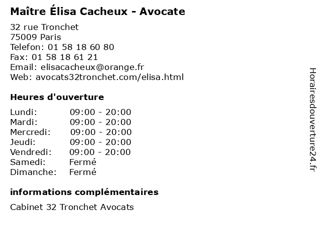 1 Maître Élisa Lirot - Avocate (Distance: 1,27 km) 48 Bis Rue de Monceau, 75008 Paris avocate, avocats, cabinet, conseils, contentieux, juridique, justice, lirot, litiges, maître, services, élisa 2 Square Élisa-Borey (Distance: 4,67 km) 3 rue Élisa-Borey, 75020 Paris borey, jardin, parc, square, élisa 3 Cacheux Richard Louis Auguste (Distance: 32,08 km) Appartement a24, 77144 Montevrain auguste, cacheux, louis, restaurants, richard 4 École maternelle publique Émile Cacheux (Distance: 32,88 km) . Rue Curie, 77230 Saint-Mard cacheux, ecole, education, maternelle, publique, services, école, émile 5 Nathalie Richard Cacheux - Hypnothérapeute (Distance: 45,31 km) 75 Rue Dajot, 77000 Melun cacheux, hypno, hypnose, hypnothérapeute, nathalie, richard, sante 6 Maître Noémie Thuillier - Avocate (Distance: 0,00 km) 32 Rue Tronchet, 75009 Paris avocate, avocats, cabinet, conseils, contentieux, juridique, justice, litiges, maître, noémie, services, thuillier |