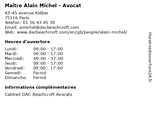 1 Maître Laurent Victor-Michel - Avocat (Distance: 0,00 km) 43-45 Avenue Kléber, 75116 Paris avocat, avocats, cabinet, conseils, contentieux, juridique, justice, laurent, litiges, maître, michel, services, victor 2 Dr Michel Mesner - Gastro-entérologue et hépatologue (Distance: 0,33 km) 5 bis Rue du Dôme, 75008 Paris consultation, docteur, dr, entérologue, et, gastro, hépatologue, med, mesner, michel, médecin, traitement 3 Maître Alain Leclerc - Avocat (Distance: 0,39 km) 15 avenue Kléber, 75116 Paris alain, avocat, cour, leclerc, maître 4 Dr Alain Iserin - Chirurgien orthopédiste (Distance: 0,41 km) 22 rue Georges Bizet, 75116 Paris alain, chirurgien, consultation, docteur, dr, iserin, med, médecin, médecine, orthopédiste, traitement 5 Maître Pierre-Alain Touchard - Avocat (Distance: 0,73 km) 147 Rue de la Pompe, 75116 Paris alain, avocat, justice, lois, maitre, maître, pierre, touchard 6 Alain Figaret (Distance: 0,74 km) 99 Rue de Longchamp, 75016 Paris alain, chemises, cravates, femme, figaret, mode homme, pantalons |