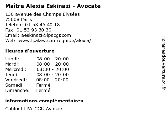 2 Maître Alexia Pharès - Avocate (Distance: 0,24 km) 66 avenue Marceau, 75008 Paris alexia, avocat, avocate, droit, maître, négociation, pharès 3 Maître Alexia Monne - Avocate (Distance: 0,35 km) 52 Avenue Hoche, 75008 Paris alexia, avocate, avocats, cabinet, conseils, contentieux, juridique, justice, litiges, maître, monne, services 4 Maître Alexia Walczak - Avocate (Distance: 0,53 km) 23 Rue d’Artois, 75008 Paris alexia, avocate, avocats, cabinet, conseils, contentieux, juridique, justice, litiges, maître, services, walczak 5 Maître Alexia Boursier - Avocat (Distance: 0,57 km) 103 Rue La Boétie, 75008 Paris alexia, avocat, boursier, justice, lois, maitre, maître 6 Maître Alexia Russell - Avocate (Distance: 0,67 km) 28 Avenue Victor Hugo, 75116 Paris alexia, avocate, avocats, cabinet, conseils, contentieux, juridique, justice, litiges, maître, russell, services |
