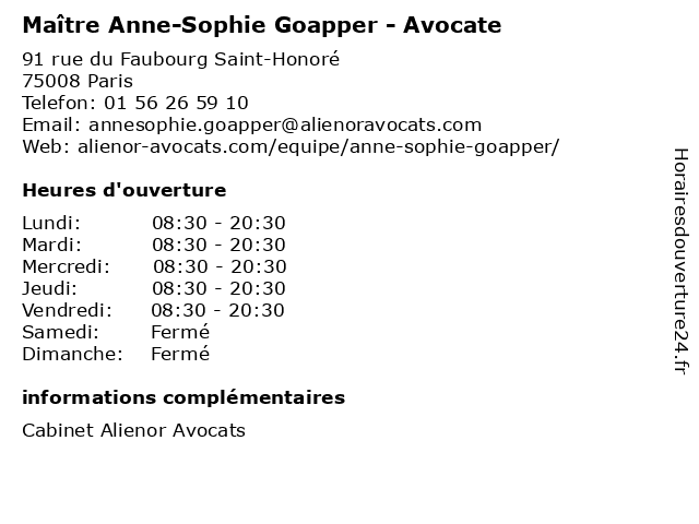 1 Maître Sophie Gallier-Larroque - Avocate (Distance: 0,00 km) 264 Rue du Faubourg Saint Honoré, 75008 Paris avocate, avocats, cabinet, conseils, contentieux, gallier, juridique, justice, larroque, litiges, maître, services, sophie 2 Maître Anne Devilliers - Avocate (Distance: 0,00 km) 68 rue du Faubourg Saint-Honoré, 75008 Paris anne, avocate, avocats, cabinet, conseils, contentieux, devilliers, juridique, justice, litiges, maître, services 3 Maître Anne-Sophie Partaix - Avocate (Distance: 0,03 km) 72 Rue du Faubourg Saint-Honoré, 75008 Paris anne, avocat, avocate, droit, maître, négociation, partaix, sophie 4 Maître Anne-Claire Hans - Avocate (Distance: 0,06 km) 16 rue de l’Élysée, 75008 Paris anne, avocate, avocats, cabinet, claire, conseils, contentieux, hans, juridique, justice, litiges, maître, services 5 Maître Sophie Lok - Avocate (Distance: 0,38 km) 17 avenue Matignon, 75008 Paris avocat, avocate, droit, lok, maître, négociation, sophie 6 Maître Anne Leleu-Eté - Avocate (Distance: 0,41 km) 30 rue Cambacérès, 75008 Paris anne, avocate, avocats, cabinet, conseils, contentieux, eté, juridique, justice, leleu, litiges, maître, services |