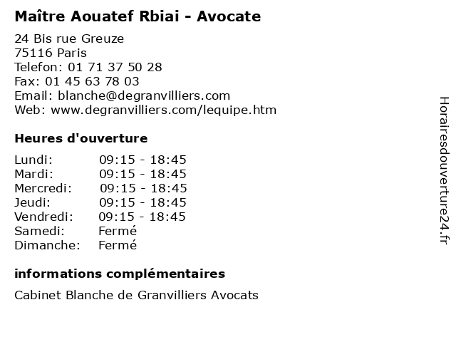 1 Maître Blanche de Granvilliers - Avocate (Distance: 0,00 km) 24 Bis rue Greuze, 75116 Paris avocate, avocats, blanche, cabinet, conseils, contentieux, de, granvilliers, juridique, justice, litiges, maître, services 2 Maître Berthold Lipskind - Avocat (Distance: 0,00 km) 24 Bis rue Greuze, 75116 Paris avocat, avocats, berthold, cabinet, conseils, contentieux, juridique, justice, lipskind, litiges, maître, services 3 Maître Elodie Dhenry - Avocate (Distance: 0,00 km) 24 Bis rue Greuze, 75116 Paris avocate, avocats, cabinet, conseils, contentieux, dhenry, elodie, juridique, justice, litiges, maître, services 4 Maître Marion Souid - Avocate (Distance: 0,00 km) 24 Bis rue Greuze, 75116 Paris avocate, avocats, cabinet, conseils, contentieux, juridique, justice, litiges, marion, maître, services, souid 5 Maître Jean-Thomas Pradillon - Avocat (Distance: 0,00 km) 24 Bis rue Greuze, 75116 Paris avocat, avocats, cabinet, conseils, contentieux, jean, juridique, justice, litiges, maître, pradillon, services, thomas 6 Maître Isabelle Poitout - Avocate (Distance: 0,00 km) 24 Bis Rue Greuze, 75116 Paris avocate, avocats, cabinet, conseils, contentieux, isabelle, juridique, justice, litiges, maître, poitout, services |