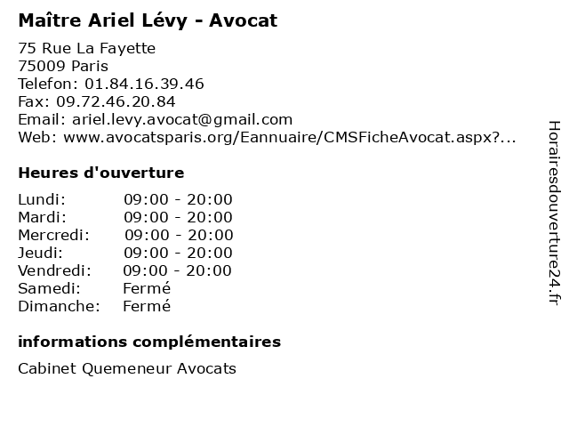 2 Maître Juliette Lévy - Avocate (Distance: 1,24 km) 98 Boulevard de Sébastopol, 75003 Paris avocate, avocats, cabinet, conseils, contentieux, juliette, juridique, justice, litiges, lévy, maître, services 3 Maître Judith Lévy - Avocate (Distance: 1,33 km) 5 Rue de Provence, 75009 Paris avocate, avocats, cabinet, conseils, contentieux, judith, juridique, justice, litiges, lévy, maître, services 4 Maître Michaël Lévy - Avocat (Distance: 1,84 km) 90 Rue d’Amsterdam, 75009 Paris avocat, droit, lévy, maître, michaël, négociation 5 Maître Juliette Lévy-Bissonnet - Avocate (Distance: 1,98 km) 3 Rue du Louvre, 75001 Paris avocate, avocats, bissonnet, cabinet, conseils, contentieux, juliette, juridique, justice, litiges, lévy, maître, services 6 Maître Sophie Lévy - Avocate (Distance: 2,48 km) 1 rue d'Astorg, 75008 Paris avocate, avocats, cabinet, conseils, contentieux, juridique, justice, litiges, lévy, maître, services, sophie |
