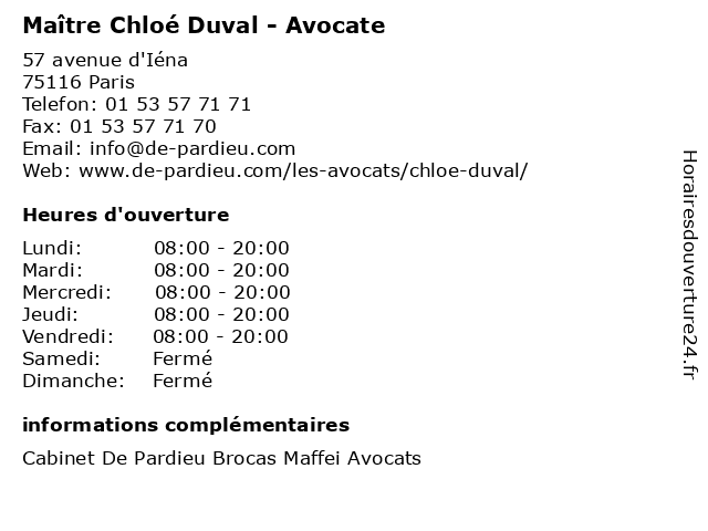 1 Maître Chloé Quenez - Avocate (Distance: 0,00 km) 57 Avenue d'Iéna, 75116 Paris avocat, avocate, chloé, droit, maître, négociation, quenez 2 Maître Chloé Stonex - Avocate (Distance: 0,21 km) 66 avenue Marceau, 75008 Paris avocat, avocate, chloé, droit, maître, négociation, stonex 3 Chloé Bruneau - Notaire (Distance: 0,49 km) 15 Rue Freycinet, 75116 Paris bruneau, chloé, etude, huissier, justice, maitre, notaire, notaires 4 Maître Romain Duval - Avocat (Distance: 0,52 km) 36 rue Beaujon, 75008 Paris avocat, avocats, cabinet, conseils, contentieux, duval, juridique, justice, litiges, maître, romain, services 5 Maître Chloé Charbeaux - Avocate (Distance: 0,68 km) 8 Place d'Iéna, 75116 Paris avocat, avocate, charbeaux, chloé, droit, maître, négociation 6 Pressing Duval (Distance: 0,75 km) 3 Rue Robert Estienne, 75008 Paris blanchisserie, duval, lavage, nettoyage, pressing, repassage, vêtement |