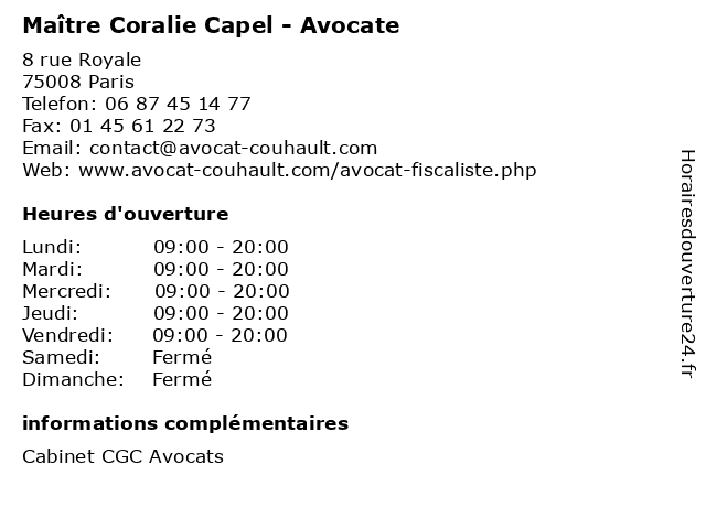 1 Maître Coralie Furgaut - Avocate (Distance: 0,09 km) 11 Rue Saint-Florentin, 75008 Paris avocate, avocats, cabinet, conseils, contentieux, coralie, furgaut, juridique, justice, litiges, maître, services 2 Capel Store (Distance: 0,62 km) 26 boulevard Malesherbes, 75008 Paris capel, clothing, men's fashion, store 3 Maître Coralie Oger - Avocate (Distance: 1,02 km) 12-14 Rond Point des Champs Elysées, 75008 Paris avocat, avocate, coralie, droit, maître, négociation, oger 4 Maître Coralie Trichard - Avocate (Distance: 1,58 km) 26 avenue George V, 75008 Paris avocate, avocats, cabinet, conseils, contentieux, coralie, juridique, justice, litiges, maître, services, trichard 5 Maître Coralie Villemur-Imberton - Avocate (Distance: 1,99 km) 66 avenue d’Iéna, 75116 Paris avocate, avocats, cabinet, conseils, contentieux, coralie, imberton, juridique, justice, litiges, maître, services, villemur 6 Capel Store (Distance: 2,08 km) 11/13 Rue de Tournon, 75006 Paris accessories, capel, clothing, collection, fashion, store |