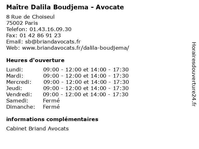 1 Maître Dalila Elman - Avocate (Distance: 0,81 km) 62 Rue Saint Lazare, 75009 Paris avocate, avocats, cabinet, conseils, contentieux, dalila, elman, juridique, justice, litiges, maître, services 2 Maître Dalila Ahmedi - Avocate (Distance: 1,18 km) 16 Rue de Turbigo, 75002 Paris ahmedi, avocate, avocats, cabinet, conseils, contentieux, dalila, juridique, justice, litiges, maître, services 3 Dr Dalila Sahridj - Médecin du travail (Distance: 1,61 km) 80 rue de Clichy, 75009 Paris consultation, dalila, docteur, dr, du, med, médecin, sahridj, traitement, travail 4 Maître Dalila Mabrouki-Jacques - Avocate (Distance: 1,94 km) 69 avenue Franklin Delano Roosevelt, 75008 Paris avocate, avocats, cabinet, conseils, contentieux, dalila, jacques, juridique, justice, litiges, mabrouki, maître, services 5 Maître Dalila Mesnata - Avocate (Distance: 1,94 km) 69 Avenue Franklin Delano Roosevelt, 75008 Paris avocat, avocate, dalila, droit, maître, mesnata, négociation 6 Maître Dalila Alaouchiche - Avocate (Distance: 2,39 km) 2 Rue de Logelbach, 75017 Paris alaouchiche, avocate, avocats, cabinet, conseils, contentieux, dalila, juridique, justice, litiges, maître, services |