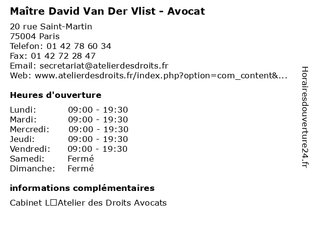 1 Maître David Wolff - Avocat (Distance: 0,08 km) 90 Rue de Rivoli, 75004 Paris avocat, avocats, cabinet, conseils, contentieux, david, juridique, justice, litiges, maître, services, wolff 2 Maître David Domoraud - Avocat (Distance: 0,16 km) 11 Boulevard de Sébastopol, 75001 Paris avocat, david, domoraud, justice, lois, maitre, maître 3 Dr Julie Van Den Broucke - Médecin généraliste (Distance: 0,32 km) 50 Rue Sainte-croix de la Bretonnerie, 75004 Paris broucke, den, docteur, dr, generaliste, généraliste, julie, medical, médecin, soin, van 5 Dr David Steuer - Chirurgien-dentiste (Distance: 0,51 km) 41 Rue des Archives, 75004 Paris chirurgien, consultation, david, dentiste, docteur, dr, med, médecin, médecine, secrétariat, steuer, traitement 6 dinh van - Corner (Distance: 0,57 km) 9 rue de la Monnaie, 75001 Paris accessoires, bijouterie, bijoux, boutique, cadeaux, corner, dinh, joaillerie, van |