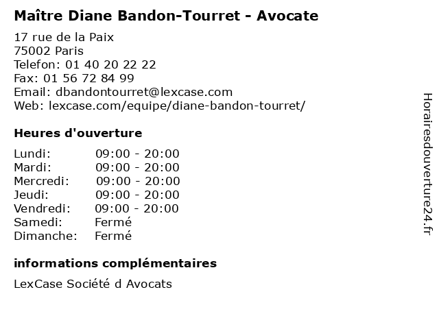 1 Maître Diane de Bustamante - Avocate (Distance: 0,23 km) 48 rue Cambon, 75001 Paris avocate, avocats, bustamante, cabinet, conseils, contentieux, de, diane, juridique, justice, litiges, maître, services 2 Maître Diane Lamarche - Avocate (Distance: 0,23 km) 19 Place Vendôme, 75001 Paris avocat, avocate, diane, droit, lamarche, maître, négociation 3 Dr Diane Naouri - Médecin généraliste (Distance: 0,32 km) 9 Rue Boudreau, 75009 Paris consultation, diane, docteur, dr, généraliste, med, médecin, naouri, traitement 4 Maître Diane Pasturel - Avocate (Distance: 0,56 km) 9 Rue des Pyramides, 75001 Paris avocate, avocats, cabinet, conseils, contentieux, diane, juridique, justice, litiges, maître, pasturel, services 5 Café Diane (Distance: 0,76 km) - Jardin des Tuileries, 75001 Paris bar, bistro, bistrot, brasserie, café, diane, restaurant, restauration 6 Maître Diane Armalet - Avocate (Distance: 1,00 km) 122 Rue du Faubourg Saint-Honoré, 75008 Paris armalet, avocate, avocats, cabinet, conseils, contentieux, diane, juridique, justice, litiges, maître, services |