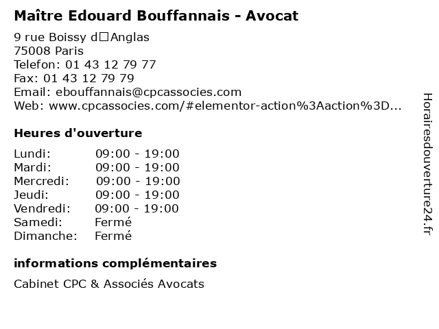 1 Maître Charles-Edouard Renault - Avocat (Distance: 0,10 km) 9 rue Boissy d’Anglas, 75008 Paris avocat, charles, droit, edouard, maître, négociation, renault 2 Maître Edouard Fortunet - Avocat (Distance: 0,33 km) 2 rue Saint- Florentin, 75001 Paris avocat, droit, edouard, fortunet, maître, négociation 3 Maître Edouard Montesinos Petit - Avocat (Distance: 0,33 km) 2 rue Saint-Florentin, 75001 Paris avocat, droit, edouard, maître, montesinos, négociation, petit 4 Parking Q-Park Edouard VII - Caumartin - Haussmann (Distance: 0,48 km) Rue Bruno Coquatrix, 75009 Paris caumartin, edouard, haussmann, park, parking, stationnement, vii 5 Restaurant Chez Edouard (Distance: 0,51 km) 7 Place Edouard VII, 75009 Paris brasserie, café, chez, edouard, restaurant, restaurants 6 Maître Edouard Bourguet - Avocat (Distance: 0,68 km) 15 Rue de Laborde, 75008 Paris avocat, bourguet, droit, edouard, maître, négociation |