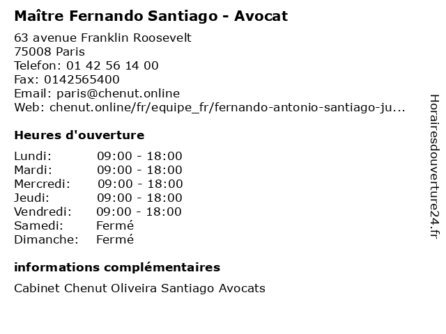 1 Maître Elodie Santiago - Avocate (Distance: 0,03 km) 69 avenue Franklin Delano Roosevelt, 75008 Paris avocate, avocats, cabinet, conseils, contentieux, elodie, juridique, justice, litiges, maître, santiago, services 2 Maître Santiago Ramirez Reyes - Avocat (Distance: 0,63 km) 4 rue Cambacérès, 75008 Paris avocat, avocats, cabinet, conseils, contentieux, juridique, justice, litiges, maître, ramirez, reyes, santiago, services 3 Maître Santiago Soto García - Avocat (Distance: 0,69 km) 32 rue de Monceau, 75008 Paris avocat, droit, garcía, maître, négociation, santiago, soto 4 Maître Fernando Mantilla-Serrano - Avocat (Distance: 1,45 km) 45 Rue Saint-Dominique, 75007 Paris avocat, droit, fernando, mantilla, maître, négociation, serrano 5 Maître Fernando Labombarda - Avocat (Distance: 1,48 km) 19 Place Vendôme, 75001 Paris avocat, avocats, cabinet, conseils, contentieux, fernando, juridique, justice, labombarda, litiges, maître, services 6 Square Santiago du Chili (Du 29 octobre au 28 février) (Distance: 1,69 km) 1 avenue de la Motte Picquet, 75007 Paris 28, 29, au, chili, du, février, jardin, octobre, parc, santiago, square |