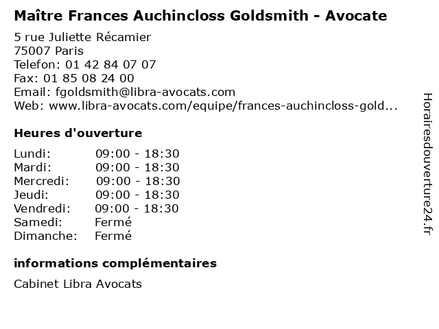 1 Maître Lord Goldsmith QC - Avocat (Distance: 1,28 km) 103 rue de Grenelle, 75007 Paris avocat, avocats, cabinet, conseils, contentieux, goldsmith, juridique, justice, litiges, lord, maître, qc, services 2 Frances Danielson Menuiserie (Distance: 4,54 km) 238 bis Boulevard voltaire, 75011 Paris danielson, frances, menuiserie, menuisier, paris 3 Eva Muflarz Frances (Distance: 5,63 km) 99 Rue des Rosiers, 93400 Saint-Ouen architecture, art forain, bijoux, céramiques, eva, frances, mobilier, muflarz, peintures & arts graphiques 4 Sherwen Annika Kerstin Frances (Distance: 5,69 km) 9 Rue Kleber, 92300 Levallois Perret annika, frances, kerstin, restaurants, sherwen 5 Cabinet Les Frances (secrétariat) (Distance: 18,57 km) 2 Avenue des Frances, 95370 Montigny Les Cormeilles cabinet, consultation, docteur, frances, les, médecins, santé, secrétariat 6 Dr Jean-Baptiste Frances - Chirurgien-dentiste (Distance: 21,05 km) 4 Rue du Réveillon, 94440 Villecresnes baptiste, chirurgien, consultation, dentiste, docteur, dr, frances, jean, med, médecin, traitement |