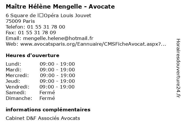 1 Maître Laure-Hélène Gardin - Avocate (Distance: 0,09 km) 9 rue Scribe, 75009 Paris avocate, avocats, cabinet, conseils, contentieux, gardin, hélène, juridique, justice, laure, litiges, maître, services 2 Maître Anne-Hélène Le Trocquer - Avocate (Distance: 0,09 km) 9 Rue Scribe, 75009 Paris anne, avocat, avocate, droit, hélène, le, maître, négociation, trocquer 3 Maître Ange Hélène Yebga-Hot - Avocate (Distance: 0,23 km) 11 rue Tronchet, 75008 Paris ange, avocate, avocats, cabinet, conseils, contentieux, hot, hélène, juridique, justice, litiges, maître, services, yebga 4 Maître Hélène Lor - Avocate (Distance: 0,26 km) 4 Rue de Castellane, 75008 Paris avocat, avocate, hélène, justice, loi, lor, maitre, maître 5 Maître Hélène Choquet - Avocate (Distance: 0,29 km) 5 boulevard de la Madeleine, 75001 Paris avocat, avocate, choquet, droit, hélène, maître, négociation 6 Maître Hélène Said - Avocate (Distance: 0,46 km) 31-33 Rue de Mogador, 75009 Paris avocate, avocats, cabinet, conseils, contentieux, hélène, juridique, justice, litiges, maître, said, services |