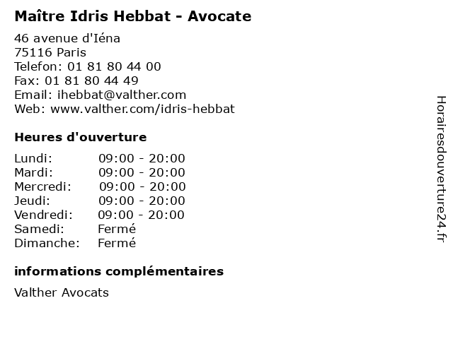 1 Maître Idris Hebbat - Avocat (Distance: 0,00 km) 46 Avenue d'Iéna, 75116 Paris avocat, droit, hebbat, idris, maître, négociation 2 Idris Nacef - Masseur-kinésithérapeute (Distance: 5,20 km) 6 Rue de l'Hôpital Saint-Louis, 75010 Paris docteur, idris, kine, kinesitherapeute, kinésithérapeute, masseur, nacef 3 Gazeau Camille Henri Idris (Distance: 7,01 km) 37 Rue De l Ermitage, 75020 Paris camille, gazeau, henri, idris, restaurants 5 Idris Dbili - Diététicien (Distance: 10,13 km) 65 Rue du Moulin de Saquet, 94800 Villejuif alimentation, dbili, dieteticien, diététicien, idris, nourriture, sante 6 In Extenso (Distance: 1,99 km) 161 rue du Faubourg Saint Honoré, 75008 Paris administratifs, agences, extenso, fiscaux, in, juridiques, sociaux |