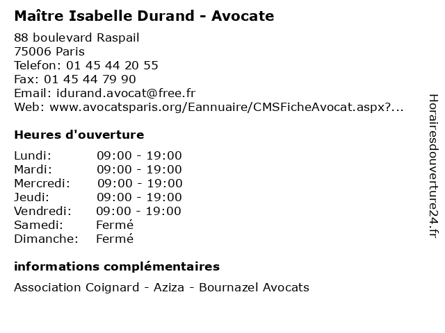 1 Dr Isabelle Durand-Viel - Médecin généraliste (Distance: 0,12 km) 85 Boulevard Raspail, 75006 Paris consultation, docteur, dr, durand, généraliste, isabelle, med, médecin, traitement, viel 2 Dr. Isabelle Mimieux - Dermatologie (Distance: 0,15 km) 36 Rue d'Assas, 75006 Paris dermatologie, docteur, dr., isabelle, medecins, mimieux, sante 3 Dr. Isabelle Jaquier - Oto-Rhino-Laryngologie (Distance: 0,15 km) 36 Rue d'Assas, 75006 Paris docteur, dr., isabelle, jaquier, laryngologie, medecins, oto, rhino, sante 4 Isabelle Miguet - Psychologue (Distance: 0,35 km) 7 Rue Stanislas, 75006 Paris cabinets, isabelle, miguet, médecins, psychologue, secrétariat, thérapies 5 Isabelle Mayadoux - Avocat spécialisé en droit social & RH (Distance: 0,38 km) 85 Rue de Rennes, 75006 Paris avocat, avocats, cabinet, droit, en, isabelle, mayadoux, représentation, rh, service, social, spécialisé 6 Maître Christiane Durand Konikoff - Avocate (Distance: 0,54 km) 7 Rue de Sèvres, 75006 Paris avocate, avocats, cabinet, christiane, conseils, contentieux, durand, juridique, justice, konikoff, litiges, maître, services |