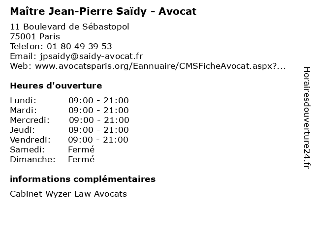 1 Maître Jean-Pierre Saïdy - Avocat (Distance: 0,00 km) 11 Boulevard de Sébastopol, 75001 Paris avocat, avocats, cabinet, conseils, contentieux, jean, juridique, justice, litiges, maître, pierre, saïdy, services 2 Cabinet Saint-Cyr Avocats Selarlu (Distance: 1,45 km) 179 bd. Saint-Germain, 75007 Paris avocat, avocats, cabinet, conseil, cyr, droit, saint, selarlu 3 Cabinet Pluvinage (Distance: 1,84 km) 32 rue Le Peletier, 75009 Paris avocat, cabinet, conseil, droit, pluvinage 4 Maître Dominique Retourné (Distance: 2,21 km) 147 rue de Rennes, 75006 Paris avocat, conseil, dominique, droit, maître, retourné 5 Maître Annie oliver (Distance: 2,30 km) 62 Rue de Caumartin, 75009 Paris annie, avocat, conseil, droit, maître, oliver 6 Avocat Droit du travail Ngawa (Distance: 2,95 km) 50 Rue de Miromesnil, 75008 Paris avocat, droit, du, law firm, lawyer, ngawa, travail |