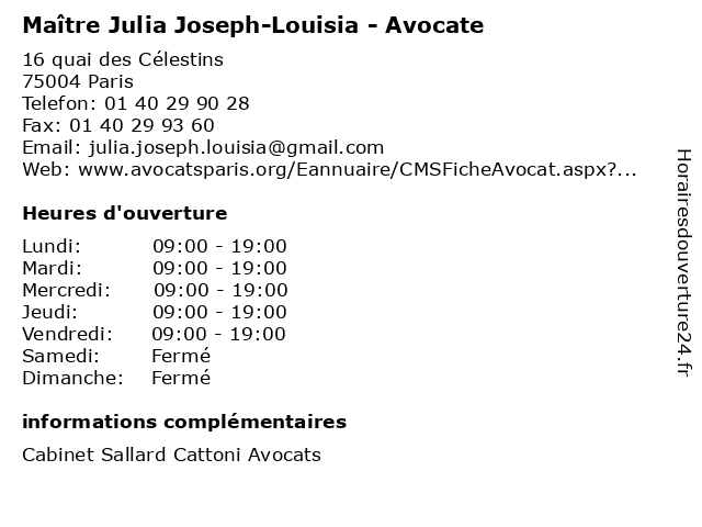 1 Maître Joseph Breham - Avocat (Distance: nan km) 16 Quai des Célestins, 75004 Paris avocat, avocats, breham, droit, joseph, lois, maître, service 2 Jardin des Rosiers - Joseph-Migneret (Du 29 octobre au 28 février) (Distance: 0,60 km) 35-37 rue des Francs-Bourgeois, 75004 Paris 28, 29, au, des, du, février, jardin, joseph, migneret, octobre, parc, rosiers, square 3 Jardin des Rosiers - Joseph-Migneret (Du 01 au 24 mars) (Distance: 0,60 km) 35-37 rue des Francs-Bourgeois, 75004 Paris 01, 24, au, des, du, jardin, joseph, mars, migneret, parc, rosiers, square 4 Jardin des Rosiers - Joseph-Migneret (Du 25 mars au 30 septembre) (Distance: 0,60 km) 35-37 rue des Francs-Bourgeois, 75004 Paris 25, 30, au, des, du, jardin, joseph, mars, migneret, parc, rosiers, septembre, square 5 Pizza Julia (Distance: 0,86 km) 43 Rue de Charenton, 75012 Paris julia, pizza, pizzeria, restaurant, restauration rapide, service 6 Dr Julia Sate - Chirurgien-dentiste (Distance: 0,88 km) 41 Rue des Archives, 75004 Paris chirurgien, consultation, dentiste, docteur, dr, julia, med, médecin, sate, traitement |