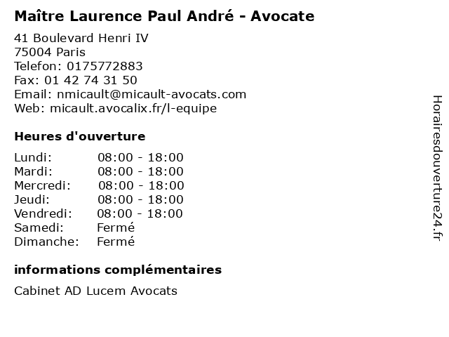 1 Maître Laurence Bilbille-Dauvois - Avocate (Distance: 0,00 km) 41 Boulevard Henri IV, 75004 Paris avocate, avocats, bilbille, cabinet, conseils, contentieux, dauvois, juridique, justice, laurence, litiges, maître, services 2 André (Distance: 0,41 km) 80/82 Rue Saint Antoine, 75004 Paris andré, chaussures, enfant, femme, homme, mode, nouveautés 3 Atelier Paul (Distance: 0,80 km) 5-18 Passage du Chantier, 75012 Paris atelier, boutique, bureaux, canapés, chaises, meubles, mobilier, paul, tables, vente 4 Square André-Lefèvre (Du 29 octobre au 28 février) (Distance: 1,30 km) 2 rue de la Parcheminerie, 75005 Paris 28, 29, andré, au, du, février, jardin, lefèvre, octobre, parc, square 5 Le Saint-André des Arts (Distance: 1,52 km) 30 Rue Saint-André des Arts, 75006 Paris andré, arts, business, cinema, des, establishments, le, movies, saint 6 Bistrot Saint André (Distance: 1,55 km) 36 Rue Saint-André des Arts, 75006 Paris andré, bistrot, café, crêpes, dessert, restaurant, saint, wine |