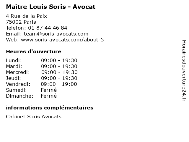 1 Soris Avocats (Distance: 0,13 km) 4 Rue de la Paix, 75002 Paris affaires, avocat, avocats, cabinet, droit, soris 3 Jean Louis David (Distance: 0,28 km) 51-53 Rue Cambon, 75001 Paris cheveux, coiffeur, david, jean, louis 4 Maître Louis-Marie Pillebout - Avocat (Distance: 0,31 km) 5 boulevard de la Madeleine, 75001 Paris avocat, avocate, avocats, droit, lois, louis, marie, maître, pillebout, pilleubot, service 5 Maître Louis Delestrée - Avocat (Distance: 0,31 km) 5 boulevard de la Madeleine, 75001 Paris avocat, delestrée, droit, louis, maître, négociation 6 Louis Vuitton (Distance: 0,45 km) 40 boulevard Haussmann, 75009 Paris accessoires, bijoux, boutique, chaussures, louis, lunettes de soleil, maroquinerie, parfums, sacs, vuitton |